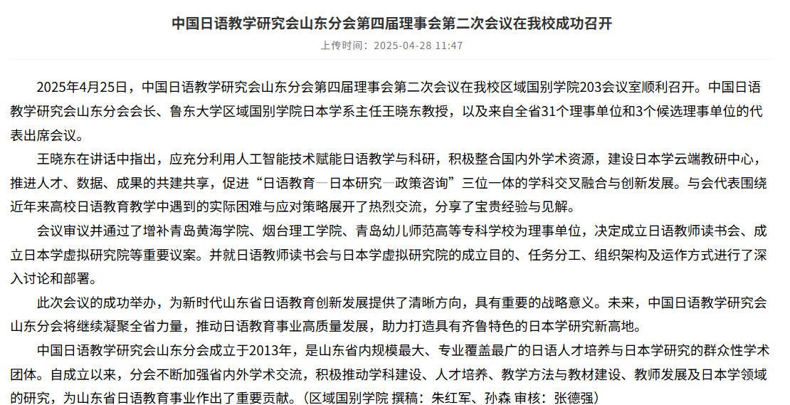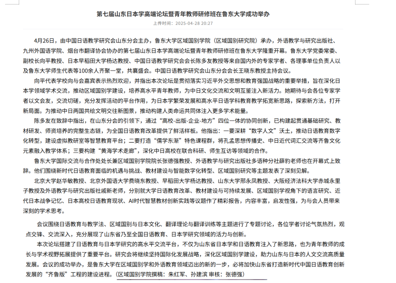 本次学院教师受邀参与研修班是学院向“开放型、研究型、创新型”外语教育高地攀登的生动注脚。学院致力于以语言为画笔,让教育成为跨文化对话的桥梁。当每一句日语讲述着中国故事,传递中国温度时,外院学子终将成为行走的“文化名片”,在日语学科的学习中点亮属于外院的璀璨星光。