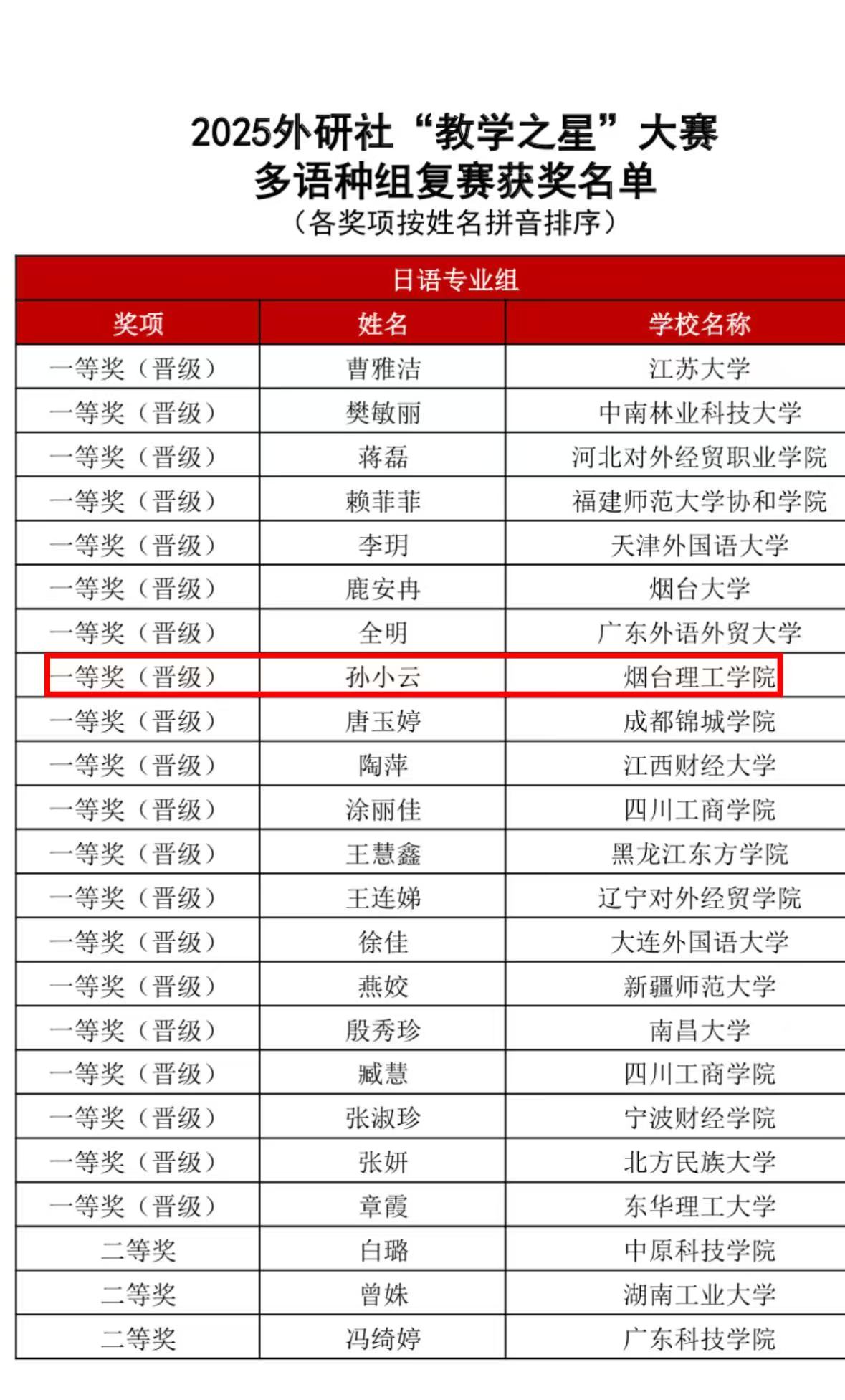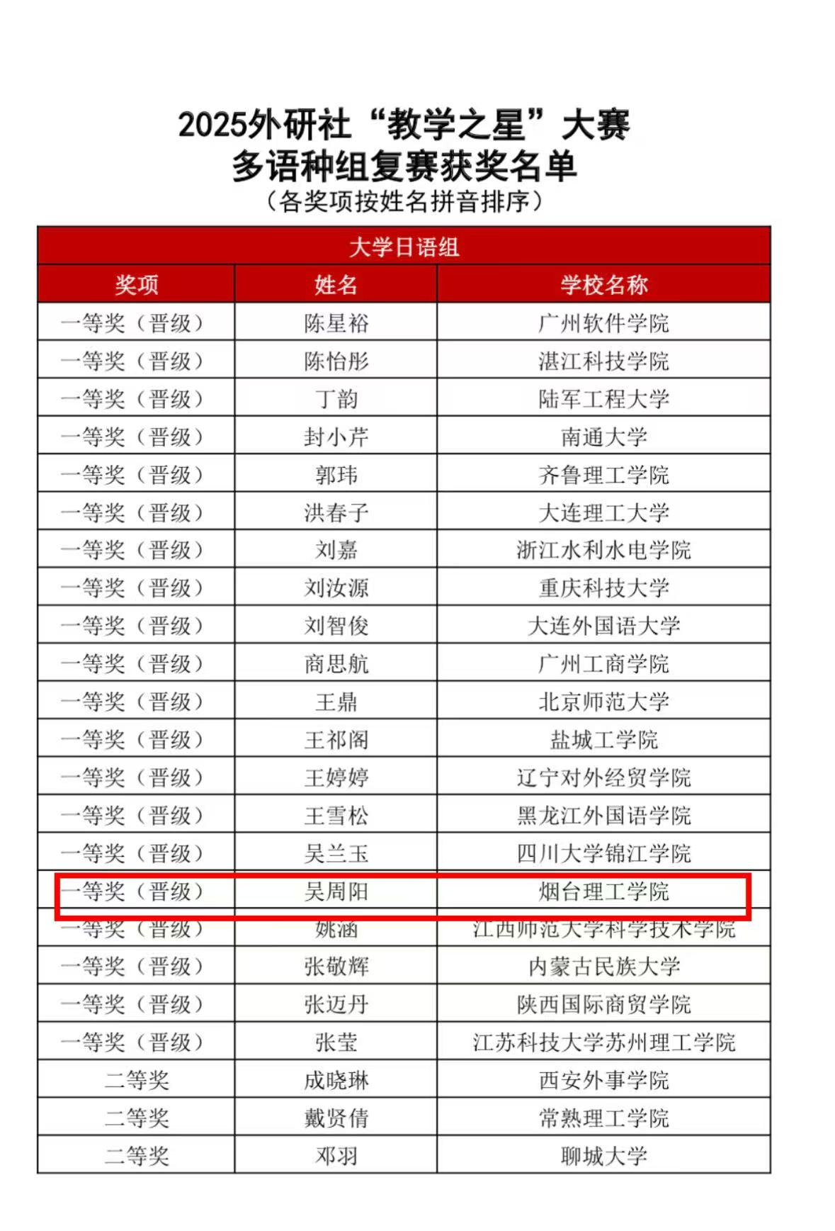 5月8日,2025年外研社“教学之星”大赛多语种组复赛结果公布,英国威廉希尔日语专业教师吴周阳、孙小云荣获一等奖,并成功晋级全国总决赛,教师臧晓梅凭借出色发挥斩获二等奖。