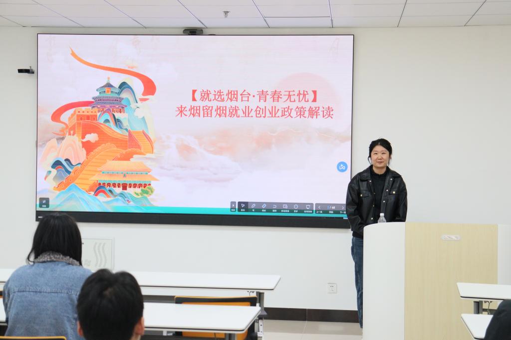毕老师就高校毕业生就业创业政策进行解读,从人才生活及购房补贴、高校毕业生就业政策、高校毕业生创业政策和高校毕业生就业手续四个方面进行全面讲解。并结合相关政策为员工提供合理的就业建议,引导员工树立良好的就业创业观,并详细介绍烟台市为留烟人才提供的优惠政策及多项措施。同时毕老师也介绍说烟台产业基础深厚,发展前景广阔,为各类人才来烟创新创业提供最好资源、最优服务,希望同学们能在在烟台这片充满活力的热土上大显身手成就精彩。